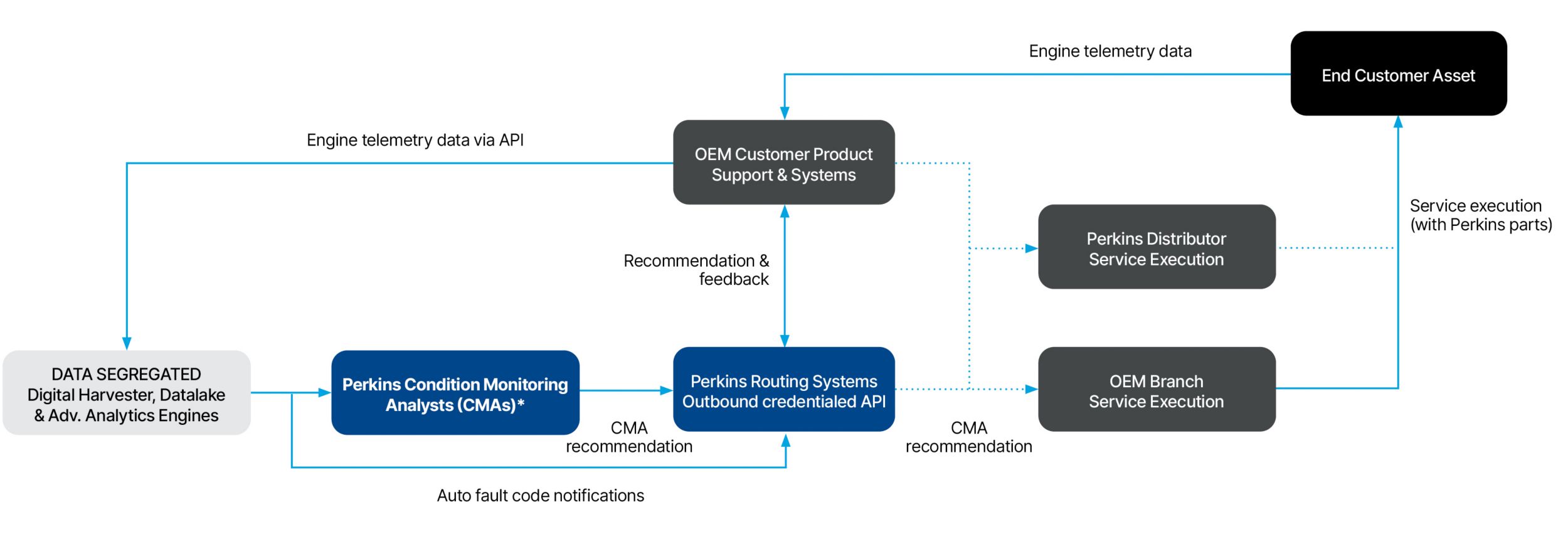Here, auto fault code notifications are segregated; further data can be analysed by Perkins Condition Monitoring Analysts (CMA) to identify more specific issues. CMA recommendations and auto fault code notifications are then routed back to the OEM’s product support systems – where they can be executed through either the Perkins distributor service route, or OEM branch service.