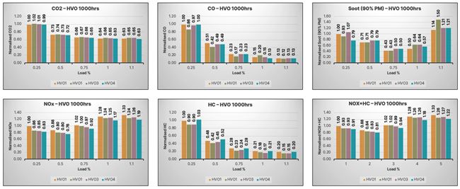 Figure 12. A comparison of emissions testing for the four HVO variants used. Note: g/kwh values were normalised against generator set output power taken from the control panel and from the 25% load HVO1 emissions measurement.