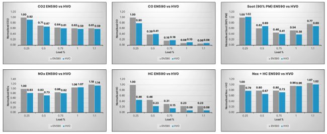 Figure 7. Emissions data comparing EN590 to HVO. Note: g/kwh values were normalised against generator set output power taken from the control panel and from the 25% load EN590 emissions measurement.