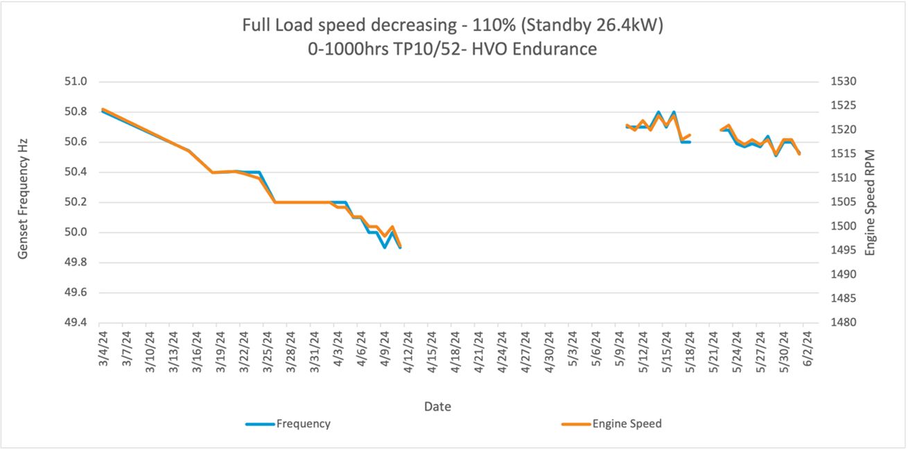 Through our high-load endurance testing, we saw that during the first 500 hours of running, the engine speed at the 110 percent load point gradually decreased over time (Figure 8) which can occur as a new engine is run-in. Before running the second 500 hours of testing, we completed a ‘high-idle adjustment,’ which brought the frequency/engine speed back up to the higher 50.8 Hz/1,525 RPMs for the start point of the second part. This was successful and we saw only a slight speed reduction during the second 500 hours of testing as shown in Figure 8.