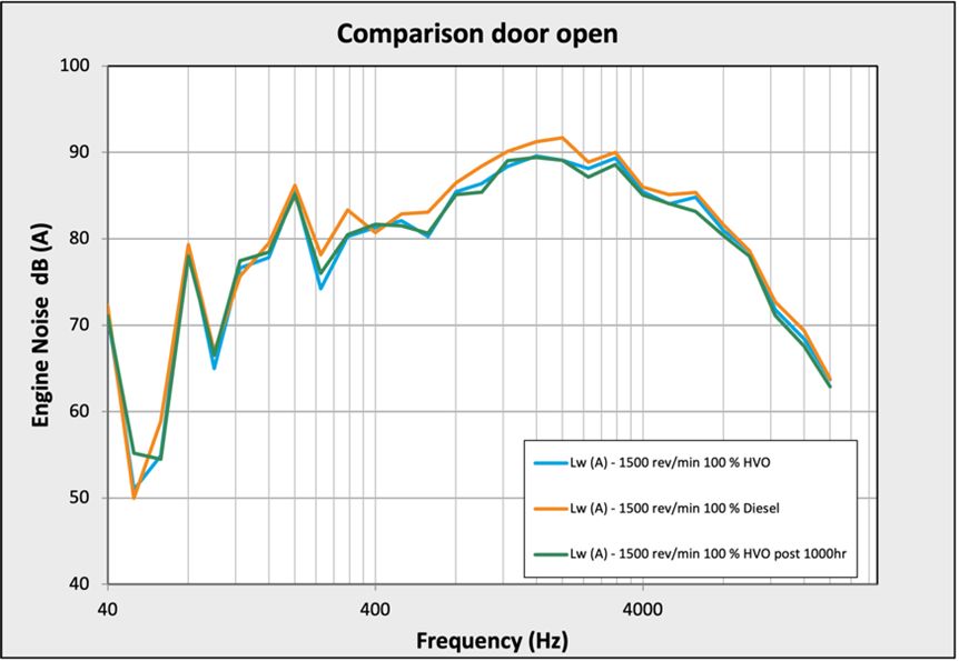 Beyond these tests, we also performed noise and vibration testing to see if there were any differences in the noise or vibration levels when running HVO in the engine. We performed a comparison of EN590 and HVO at 0 hour and then reran the testing with HVO at 1,000 hours. The main goal of this testing was to determine if a user might think something was wrong with the engine if the noise and vibration levels were significantly different when running HVO versus EN590.
