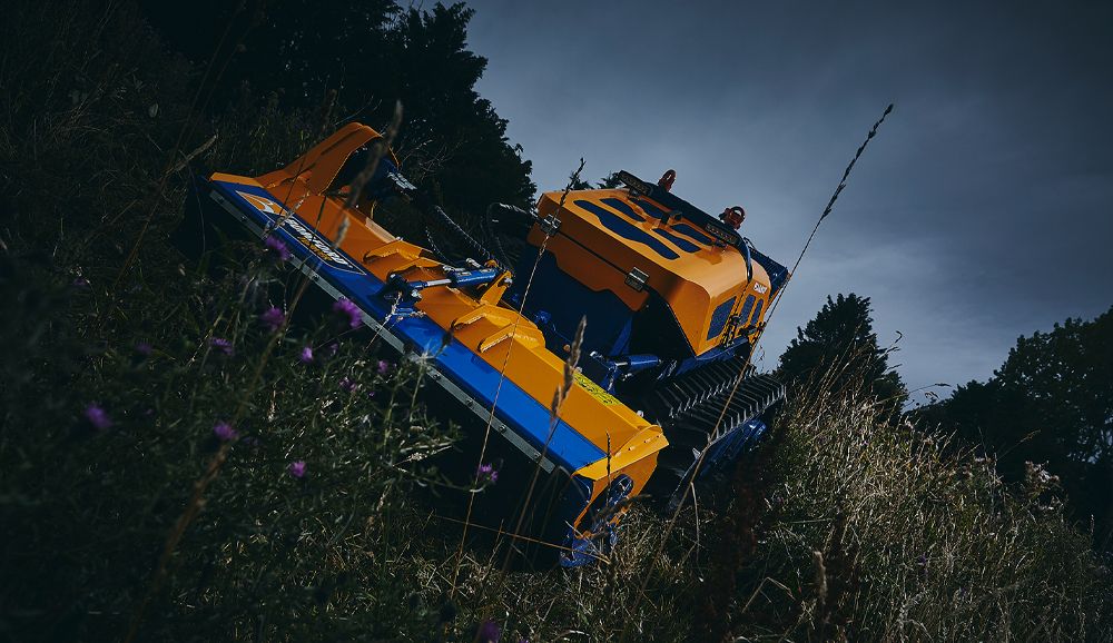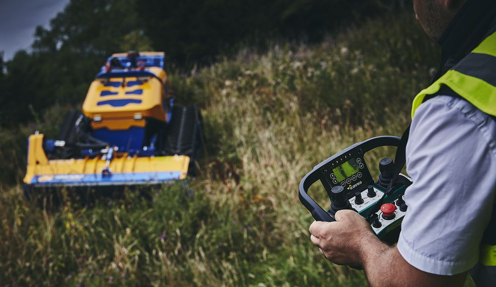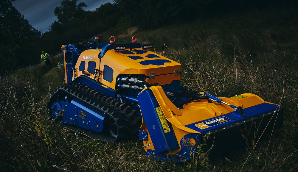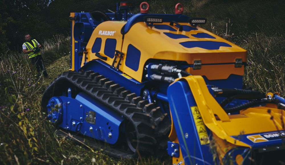 Covering challenging, steeply inclined terrain with a traditional man-on-board power mower can put a driver at risk, so the remotely controlled Flailbot provides the required mowing capability while keeping the operator at a safe distance.