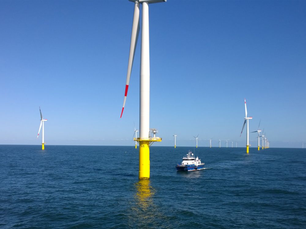 Merkur 近海风力发电厂位于德国南海距荷兰埃姆斯哈文 80 km 航程的地方。这家高科技工厂利用 66 个风力涡轮将大风天气条件转变为足够的电力来为 50 万户家庭供电。